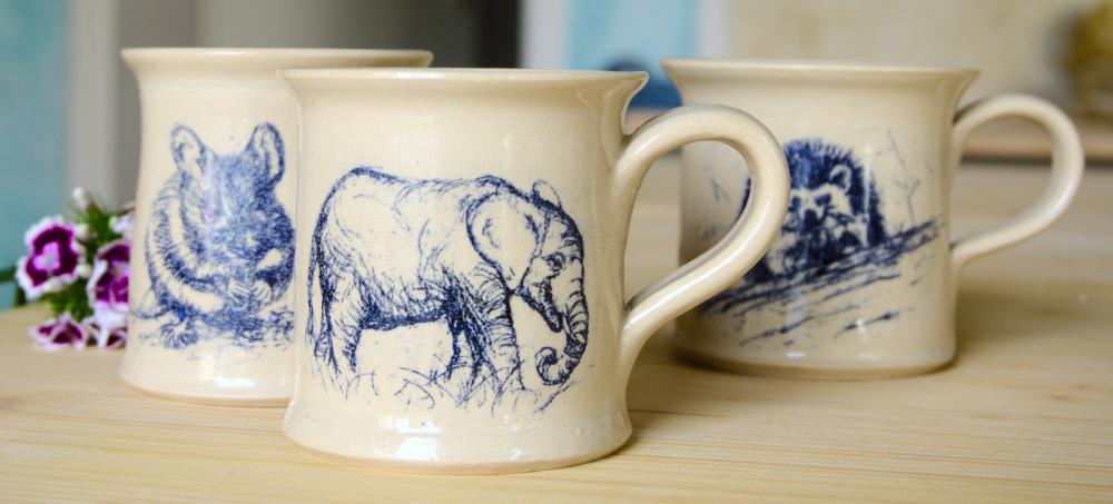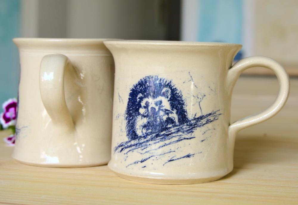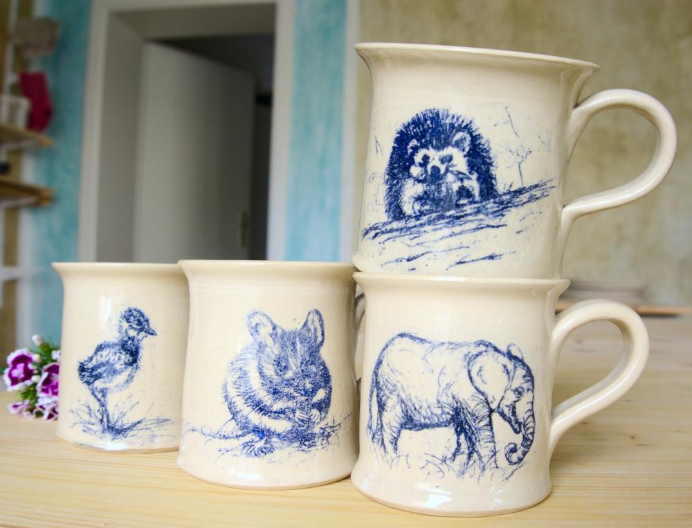 Alle Stücke aus meiner Werkstatt sind von Hand auf der Töpferscheibe gedreht, dekoriert, glasiert und bei 1130°C gebrannt. Sie sind wasserdicht und geschirrtauglich.